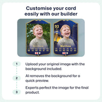 When it comes to personalising your card, the basic steps are to upload a photo and add a name to your card. Then you’ll add details like your player’s position and skill ratings out of 99 for each football skill shown on the card. Our online card builder makes this really easy. And if you aren’t a football card expert, don’t worry!