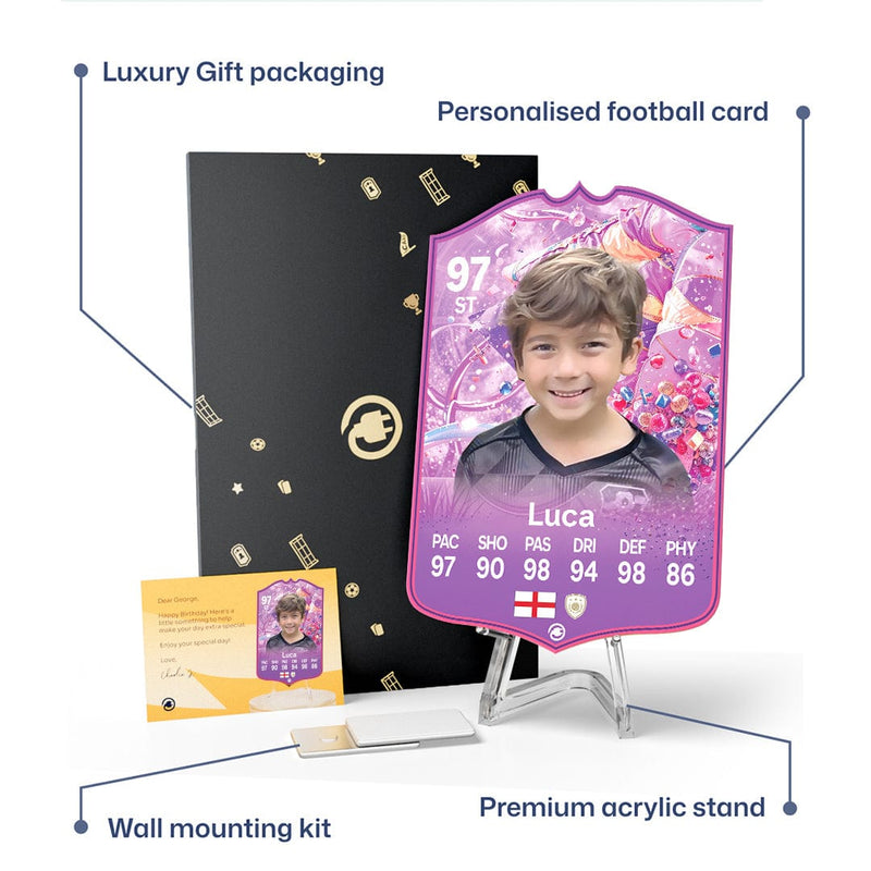 When it comes to personalising your card, the basic steps are to upload a photo and add a name to your card. Then you’ll add details like your player’s position and skill ratings out of 99 for each football skill shown on the card. Our online card builder makes this really easy. And if you aren’t a football card expert, don’t worry!