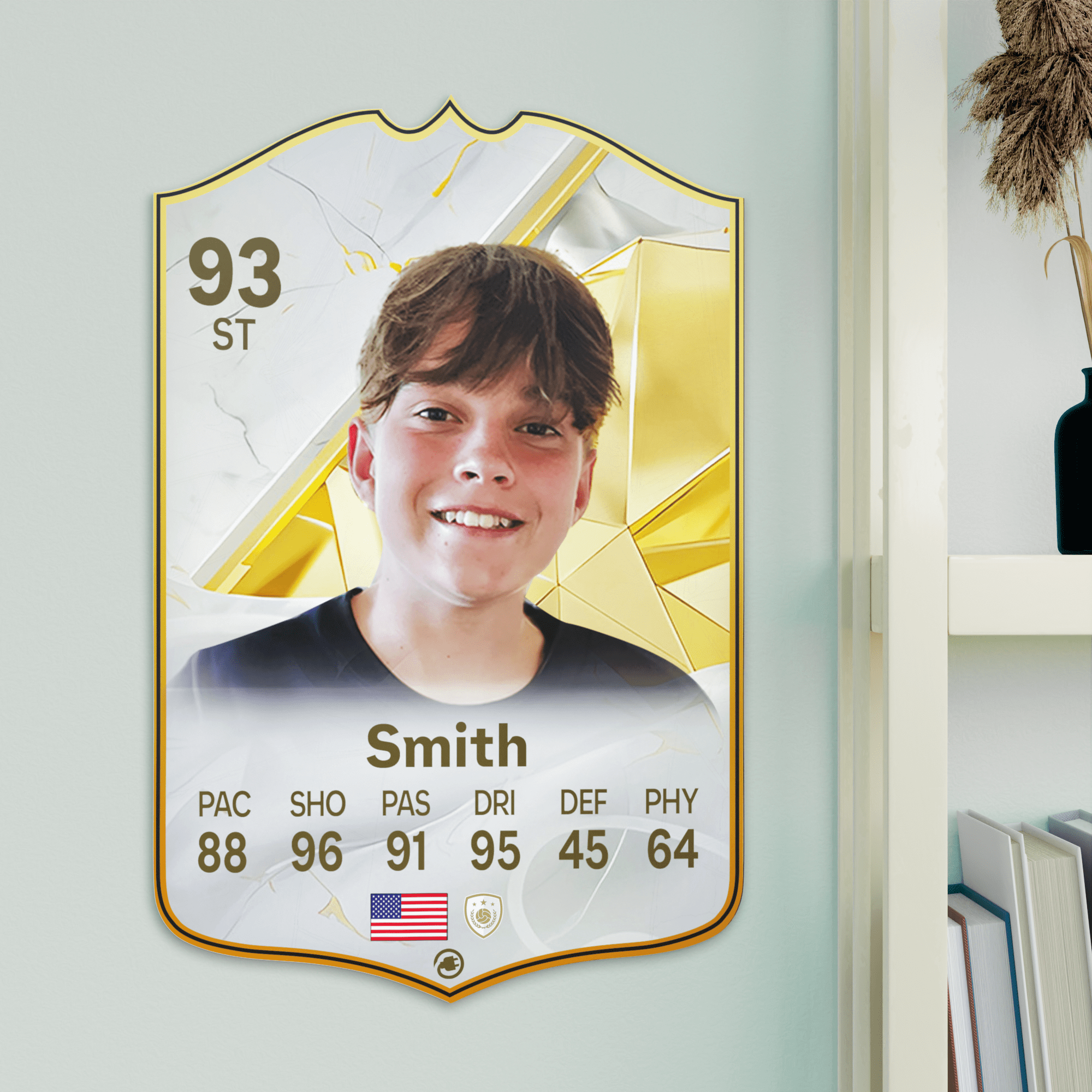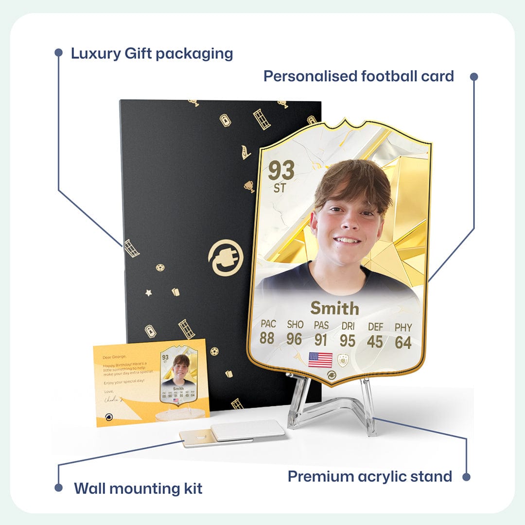 When it comes to personalising your card, the basic steps are to upload a photo and add a name to your card. Then you’ll add details like your player’s position and skill ratings out of 99 for each football skill shown on the card. Our online card builder makes this really easy. And if you aren’t a football card expert, don’t worry!