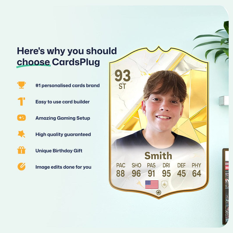 CardsPlug is home to the world’s favourite personalised football cards. Our easy football card builder lets you make a real life football card with your own name, photo, and skill ratings. With 100+ designs to choose from and some inspired by EA SPORTS FC 26 cards seen in EA FC 26, EA FC 25 and FC 24 as well as FIFA cards seen in games like FIFA 23 and FIFA 22.