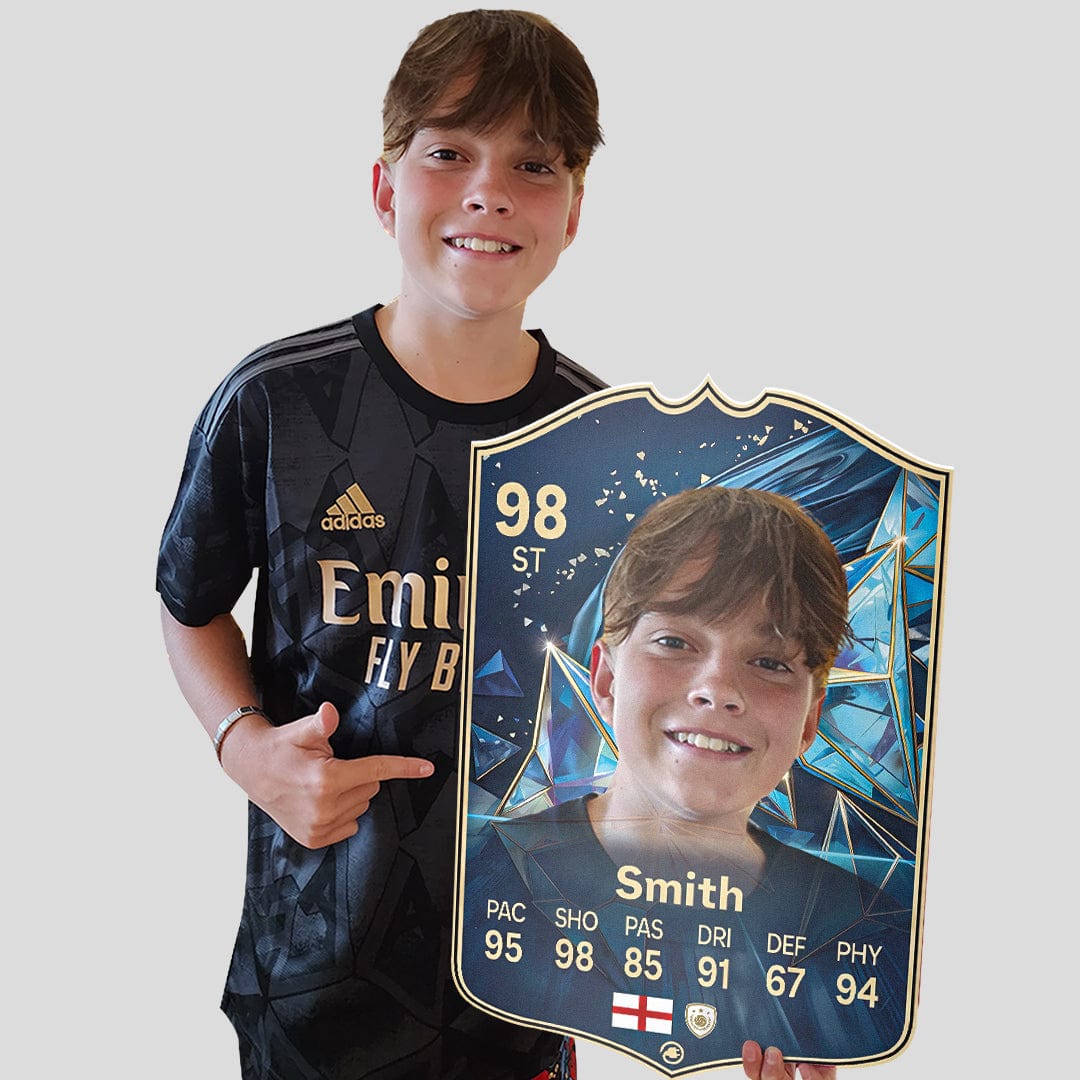 When it comes to personalising your card, the basic steps are to upload a photo and add a name to your card. Then you’ll add details like your player’s position and skill ratings out of 99 for each football skill shown on the card. Our online card builder makes this really easy. And if you aren’t a football card expert, don’t worry!