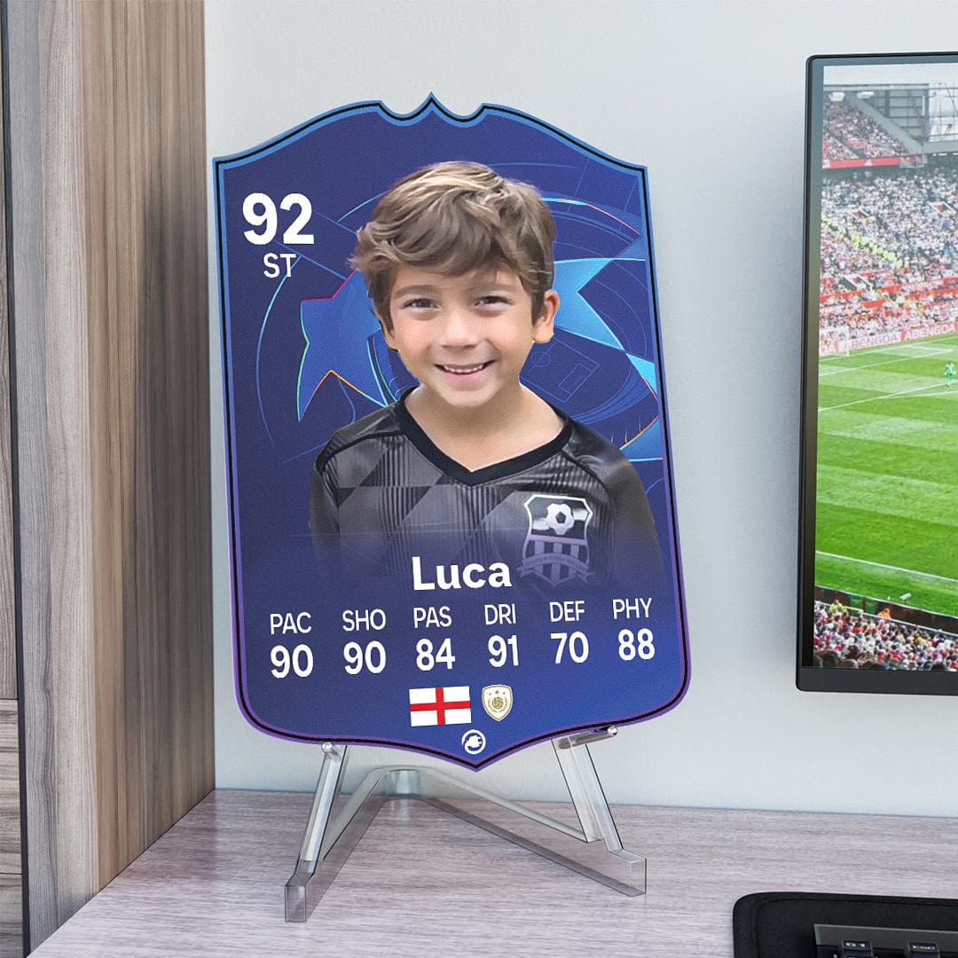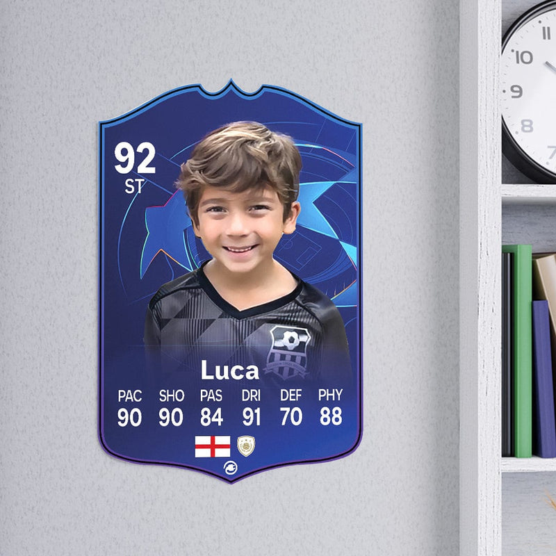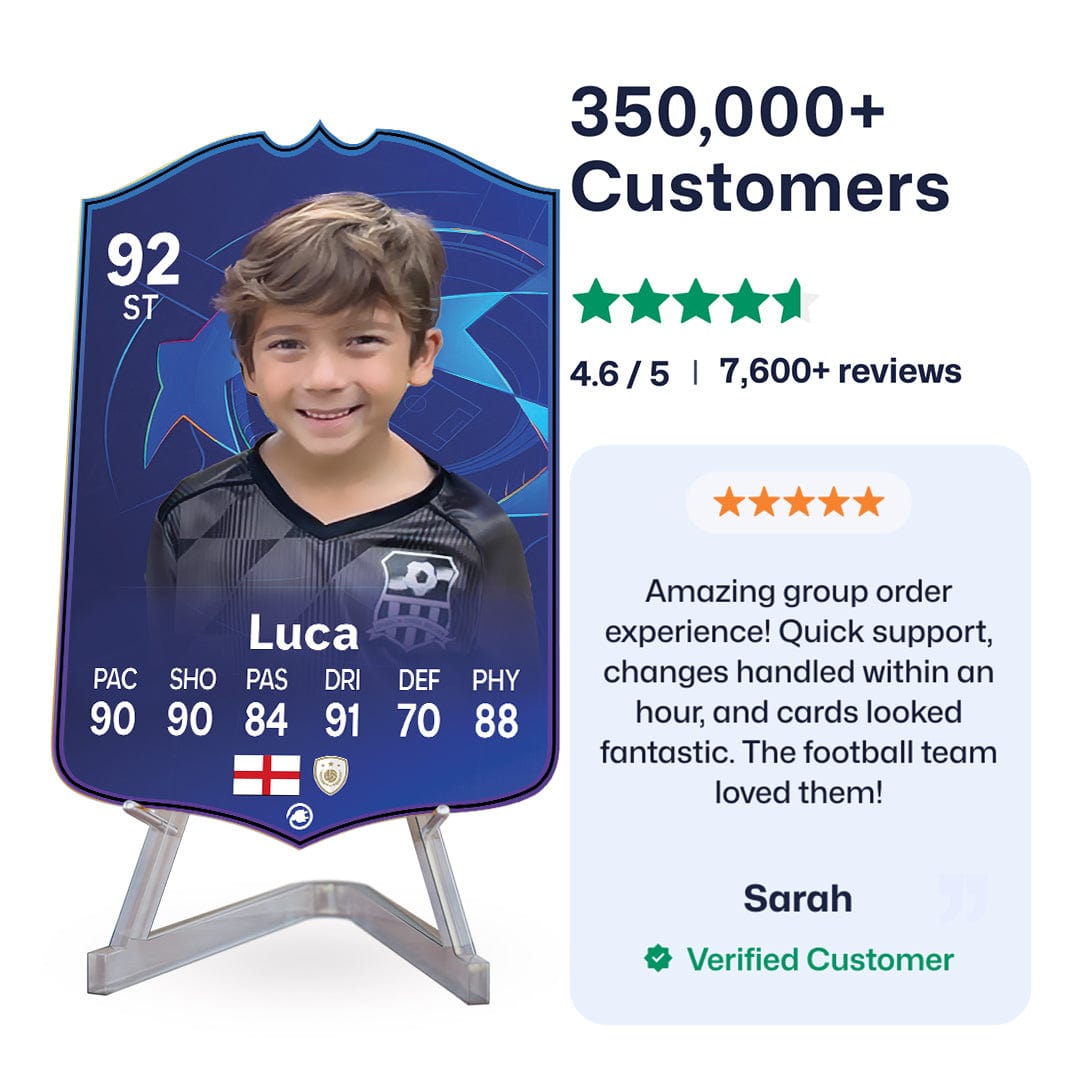 When it comes to personalising your card, the basic steps are to upload a photo and add a name to your card. Then you’ll add details like your player’s position and skill ratings out of 99 for each football skill shown on the card. Our online card builder makes this really easy. And if you aren’t a football card expert, don’t worry!