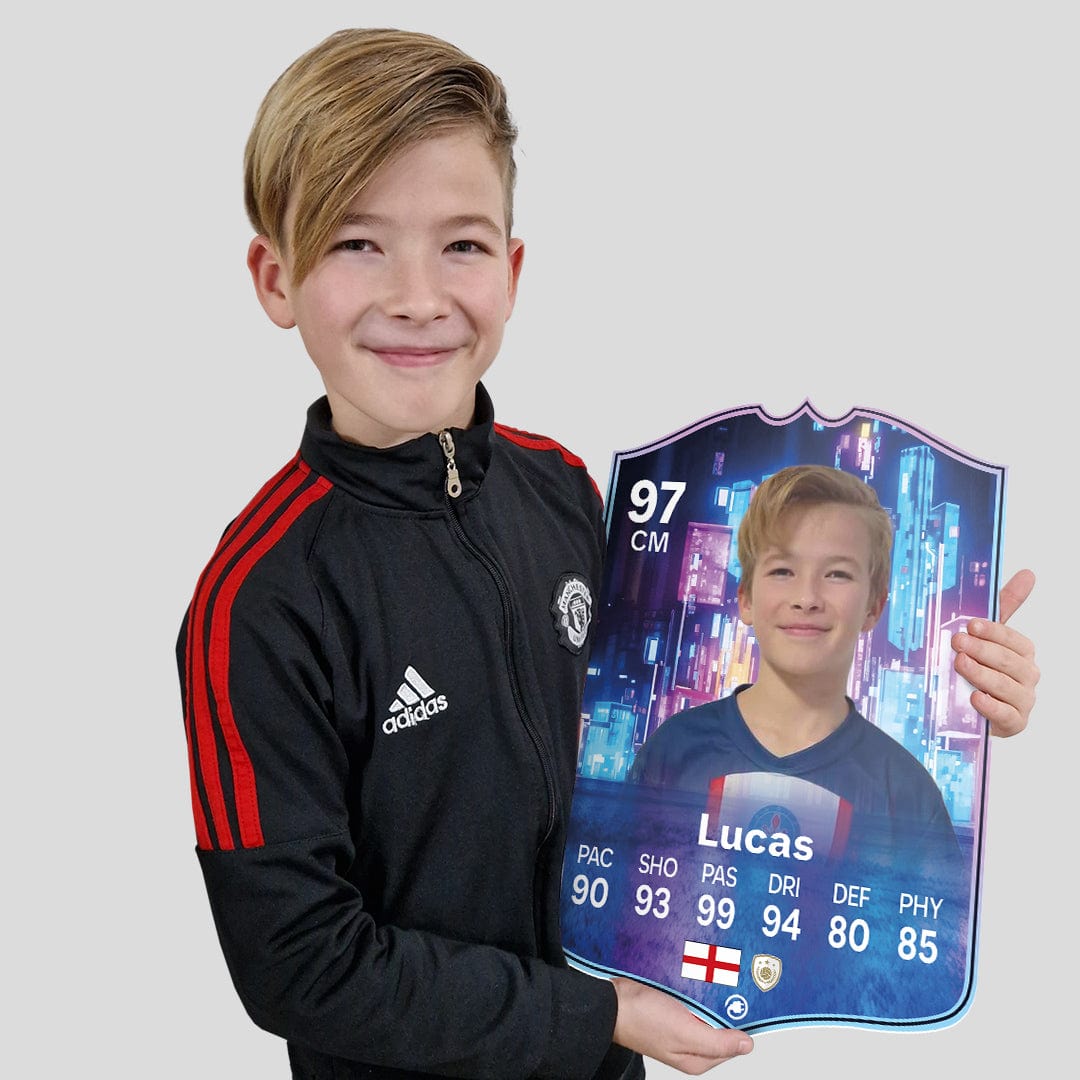 When it comes to personalising your card, the basic steps are to upload a photo and add a name to your card. Then you’ll add details like your player’s position and skill ratings out of 99 for each football skill shown on the card. Our online card builder makes this really easy. And if you aren’t a football card expert, don’t worry!