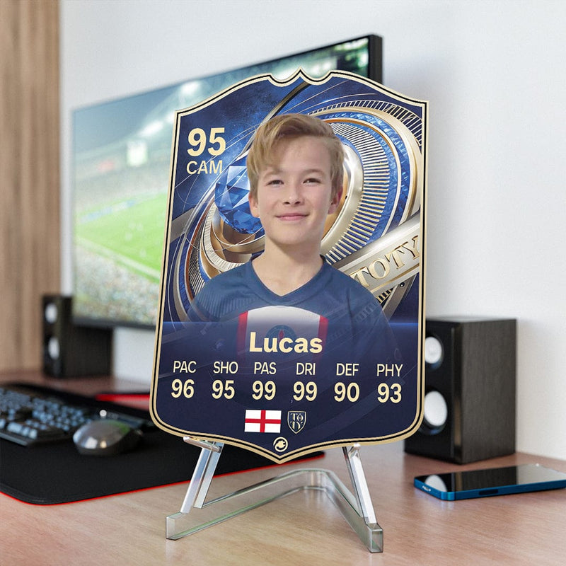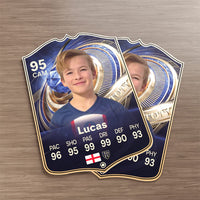When it comes to personalising your card, the basic steps are to upload a photo and add a name to your card. Then you’ll add details like your player’s position and skill ratings out of 99 for each football skill shown on the card. Our online card builder makes this really easy. And if you aren’t a football card expert, don’t worry!