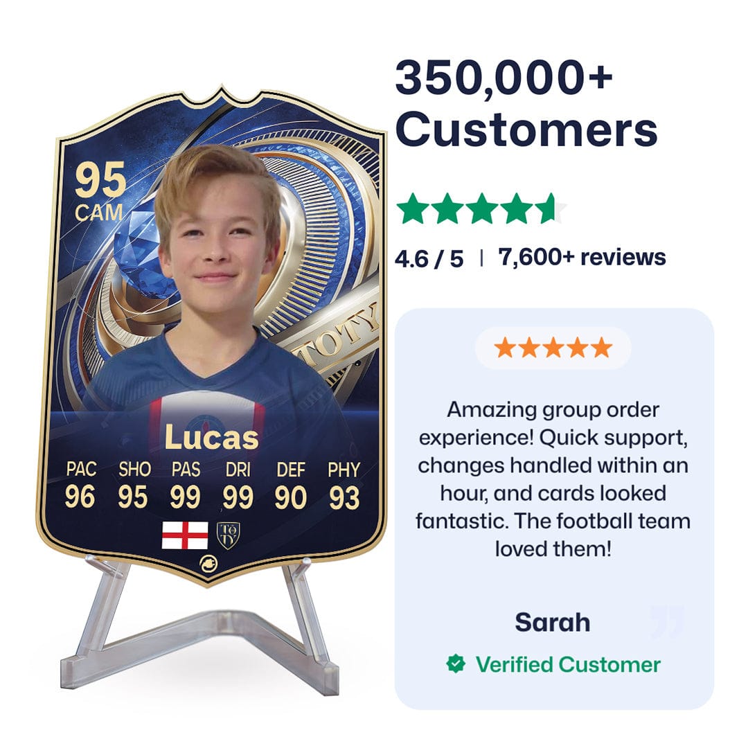 Once you’ve personalised your card, our design experts will edit your photo, design your card, and bring it to life in stunning quality. You’ll get a full preview before we print your card and every card’s quality is backed by our Gold Standard Guarantee. So far, over 350,000+ football fans agree: A CardsPlug football card is the ultimate football gift!
